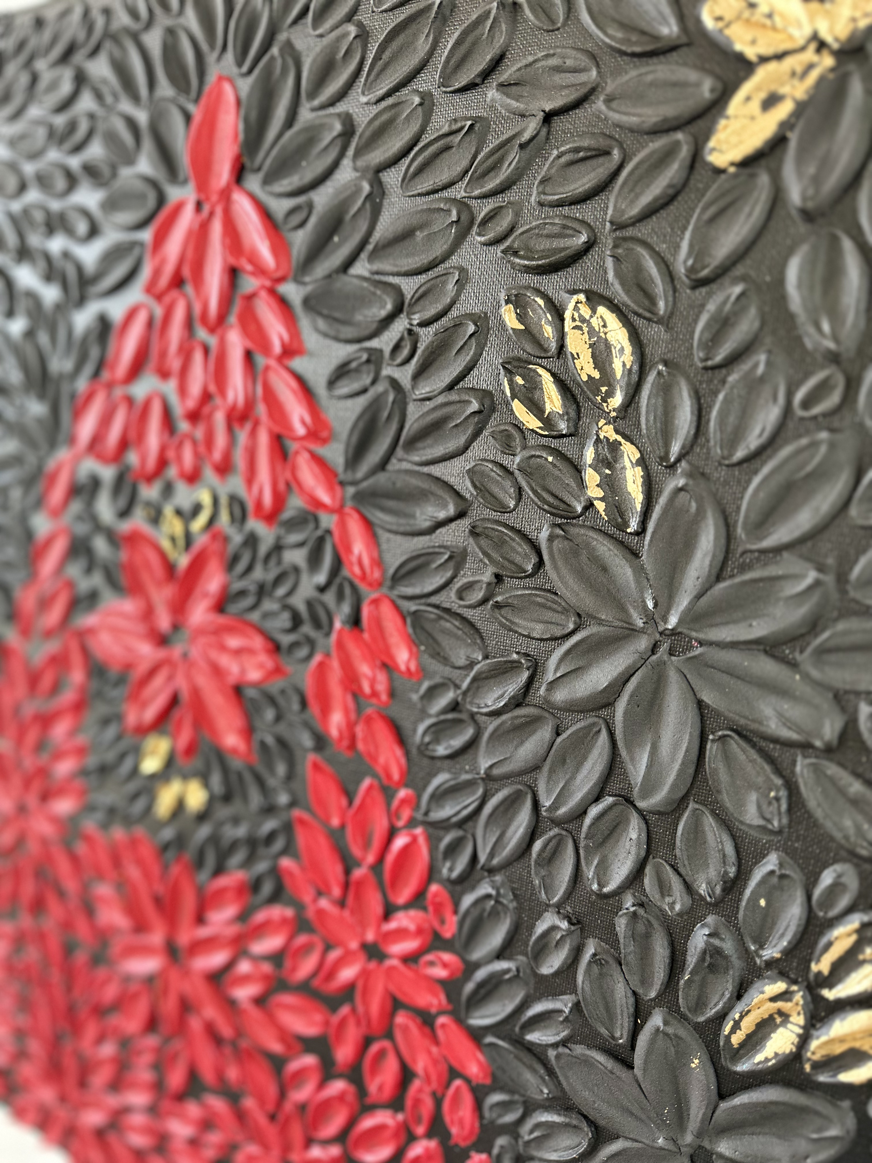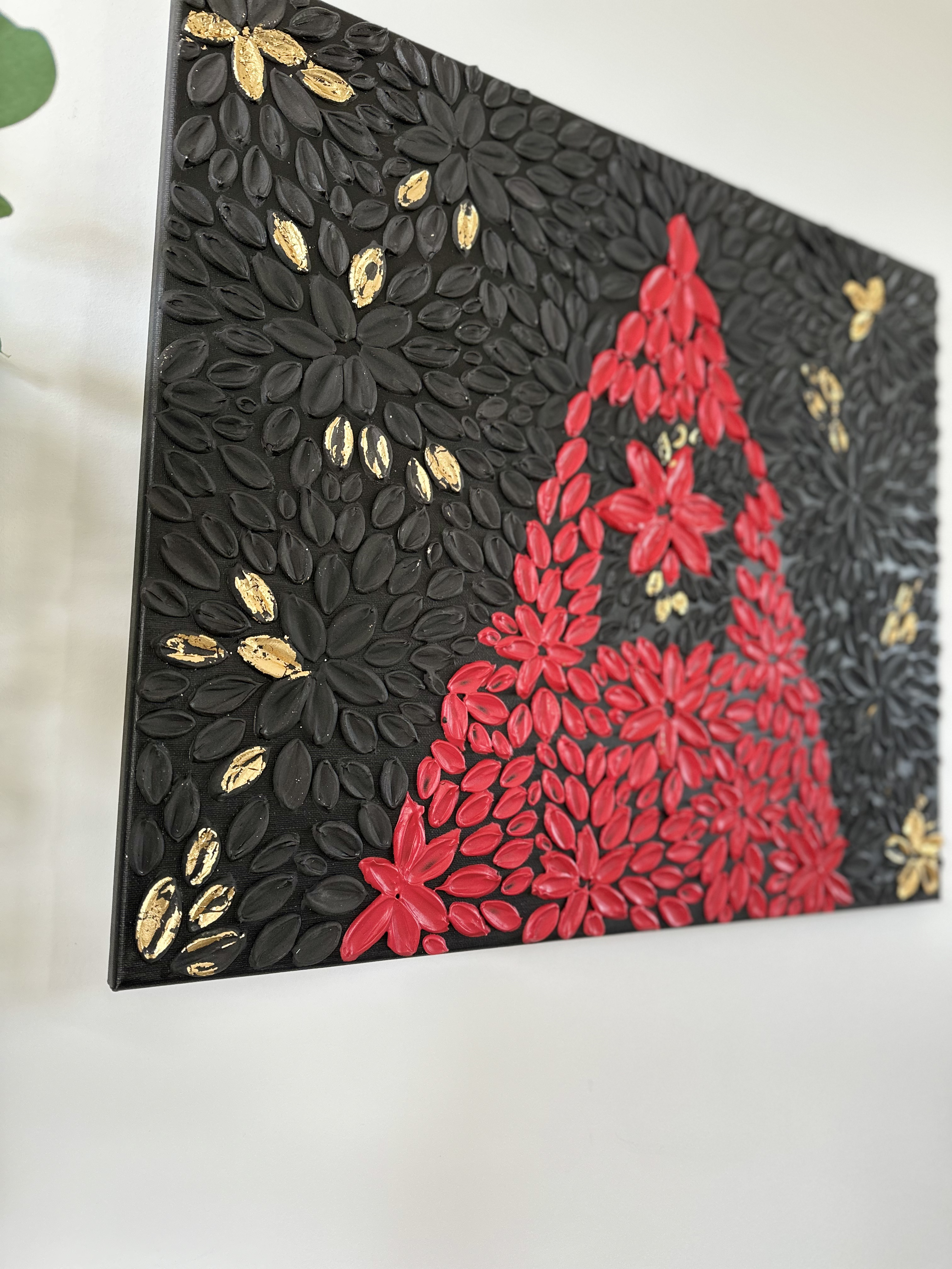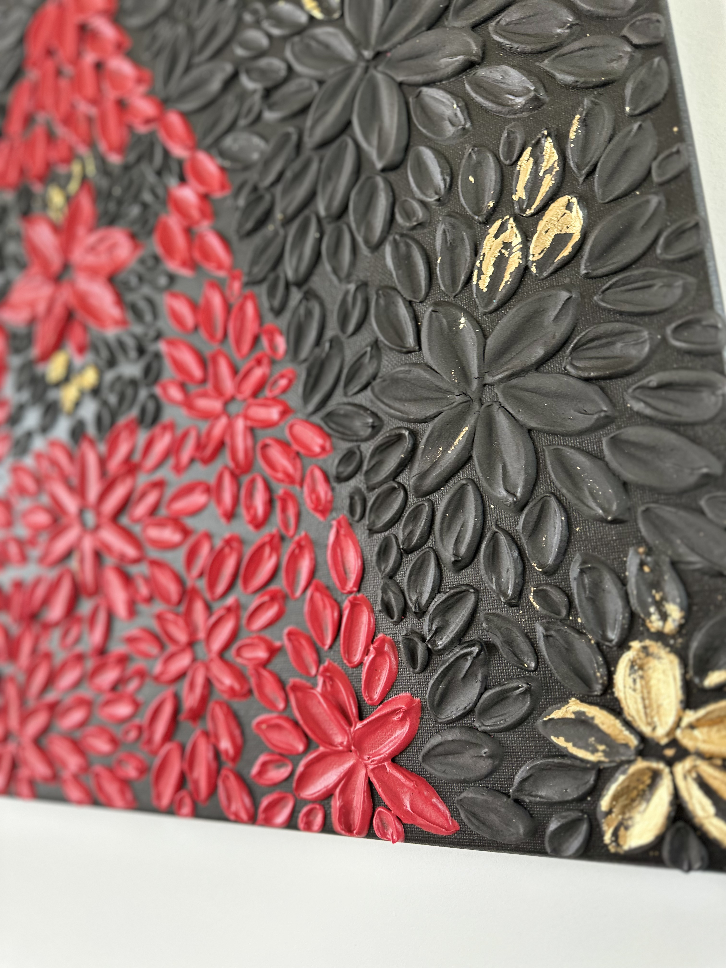 The dark aura and the sophisticated combination of black and red colours with a touch of gold petals will suit an office, home library, or study room.